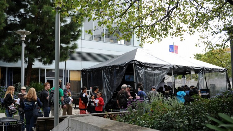 After leaving the hotel and heading toward WonderCon at the Moscone Convention Center, I encountered a tent guarded by a figure in a SWAT-like military costume patrolling a line entering the tent.