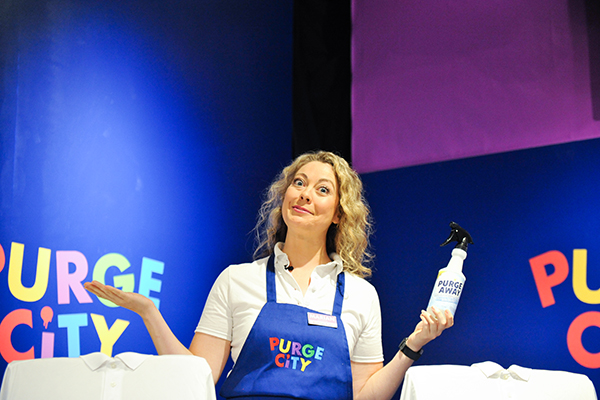 A demonstration of Purge Away detergent (or, as its termed, “depurgent”) for cleaning up the mess after the story’s annual bacchanal of crime was more lighthearted than horrifying. The perky demonstrator used a restrained blue rather than the expected blood red to illustrate the product’s cleaning ability.