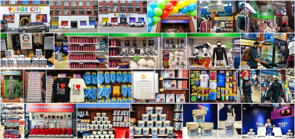 Surrounded by a balloon arch, the cheerful Purge City storefront sported a multi-colored logo with a passing resemblance to party supply chain Party City. The logo’s blood-red dripping letter “i” hinted that things may not be so cheery inside.