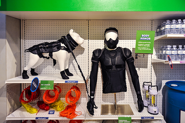 The text beneath the logo read “Your One-Stop Shop for the Perfect Purge Night.” And, indeed, inside the shelves were stocked with displays of Purge Night accoutrements. Defensive items included body armor, camouflage, 12-hour emergency purge candles, barbed wire. Less sinister were items where “tradition meets fun”: bumper stickers, t-shirts, and blue baptisia leis.